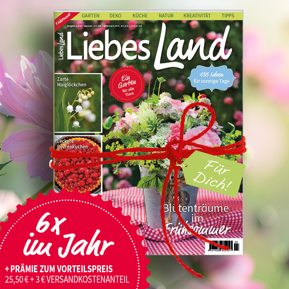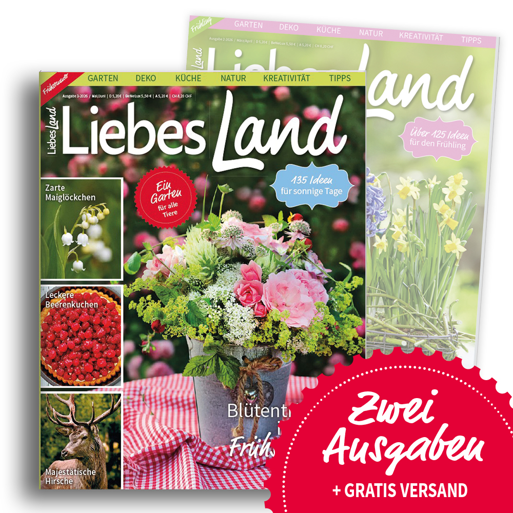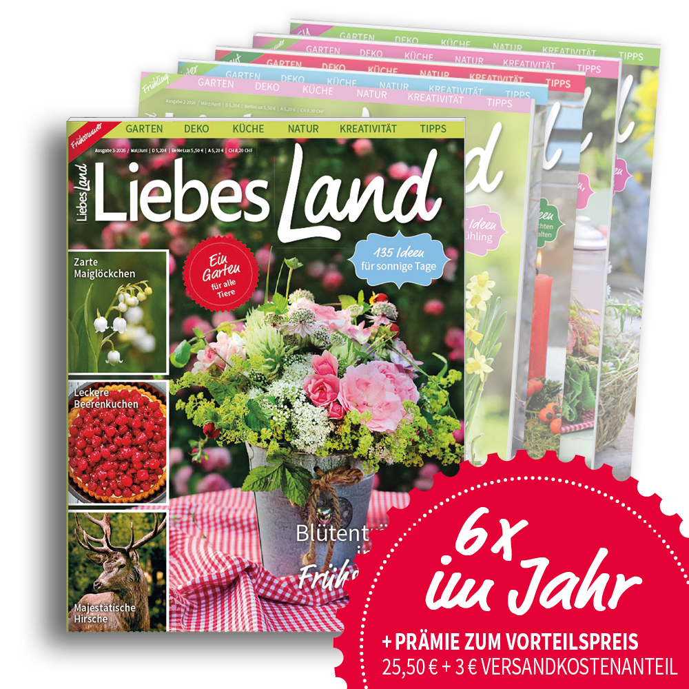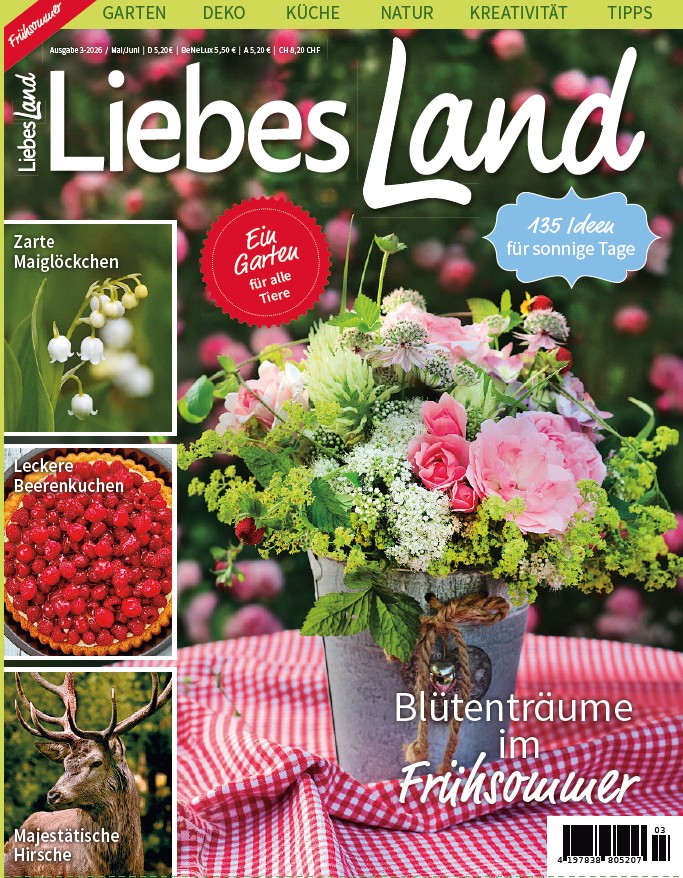 Das neue Liebes Land Magazin für Mai/Juni ist ab dem 02. April 2026 im Handel erhältlich. Ihr könnt es aber auch über unseren Shop versandkostenfrei innerhalb Deutschlands bestellen!